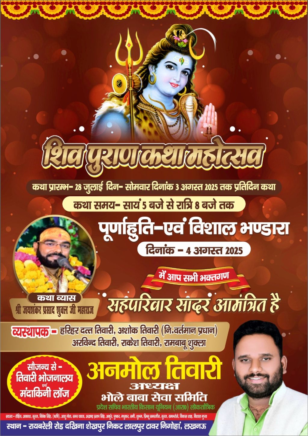अनमोल तिवारी ने बताया कि इसके बाद 4 अगस्त को पूर्णाहुति और भंडारा होगा। इससे पूर्व भी उन्होंने जग कल्याण के लिए कई बार शिव महापुराण कथा का आयोजन कराया है। कार्यक्रम स्थल पर सभी तैयारियां पूर्ण कर ली गई है। रोजाना सुबह के समय पहले मूल पाठ होगा और शाम के समय विस्तृत रूप से आए हुए लोगों को कथा का रसपान कराया जाएगा। साथ ही, क्षेत्र और समाज के कल्याण के लिए महामृत्युंजय जाप के साथ रुद्राभिषेक का कार्यक्रम भी होगा।