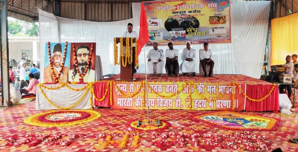 नगराम , लखनऊ। क्षेत्र के करोरा बाजार स्थित राम जानकी मंदिर परिसर से राष्ट्रीय स्वयंसेवक संघ (आरएसएस) के 100 वर्ष पूरे होने पर खंड कार्यवाह गिरीश त्रिवेदी के नेतृत्व में स्वयंसेवकों द्वारा कार्यक्रम आयोजित किया गया। इस अवसर पर स्वयंसेवकों ने पथ संचलन निकाला , मुख्य मार्ग पर महिलाओं एवं व्यापारियों द्वारा पथ संचलन कर रहे स्वयंसेवकों पर पुष्प वर्षा की गई। गिरीश त्रिवेदी ने बताया कि आरएसएस की स्थापना 1925 में विजयदशमी के दिन नागपुर में हुई थी जिसका मुख्य उद्देश्य हिंदू समाज को संगठित करना था। कार्यक्रम के मुख्य वक्ता विभाग प्रचारक अमित ने कहां की आरएसएस का कार्य किसी एक मंडल या प्रांत के लिए नहीं बल्कि पूरे हिंदुस्तान को सुसंगठित कर हिंदू समाज को आत्मरक्षा और सशक्त बढ़ाने के उद्देश्य से शुरू किया गया था। उन्होंने ‘पंच प्रण’ का आवाहन किया , जिसमें सामाजिक समरसता , कुटुंब प्रबोधन, पर्यावरण संतुलन, स्वदेशी आचरण और नागरिक कर्तव्य शामिल है। अध्यक्ष आनंद स्वरूप महंत ने देशभक्ति को जीवन जीने का तरीका बताया , जिला संघ चालक वीरेन्द्र ने आरएसएस ही हिंदू समाज को उसकी वर्तमान स्थिति से गौरव के शिखर तक पहुंचा सकता है । जिला कार्यवाह अजीत ने देश की आवश्यकता बताते हुए शिक्षित व्यक्तियों से इसके समर्थन की अपील की । खंड कार्यवाह गिरीश त्रिवेदी ने राष्ट्रहित को सर्वोपरि रखने वाले को सच्चा स्वयंसेवक बताया , मंडल कार्यवाह करोरा दीपक तिवारी ने भारत को महान बनाने के लिए अपनी संस्कृति अपनाने पर जोर दिया । ध्वज शिष्टाचार के बाद वाद्य यंत्रों की धुन पर शंखनाद करके करोरा गांव के मुख्य मार्गों पर पथ संचलन किया गया , गणवेश धारियों पर पुष्प वर्षा की बौछार होती रही । पथ संचलन के दौरान स्वदेश, मनीष, समर सिंह, वीरेंद्र शंकर मिश्रा , रूपेन्द्र ,रामदुलारे, अरुण मिश्रा, महेंद्र मिश्रा, अभिषेक, अंकित सैनी, अंकुर, दिलीप, दिनेश, अनुज समेत बड़ी संख्या में गणवेश धारी शामिल थे साथ ग्राम प्रधान सुधीर व नीरज त्रिवेदी एवं नगराम थाना प्रभारी विवेक चौधरी पुलिस टीम के साथ मौजूद रहे।